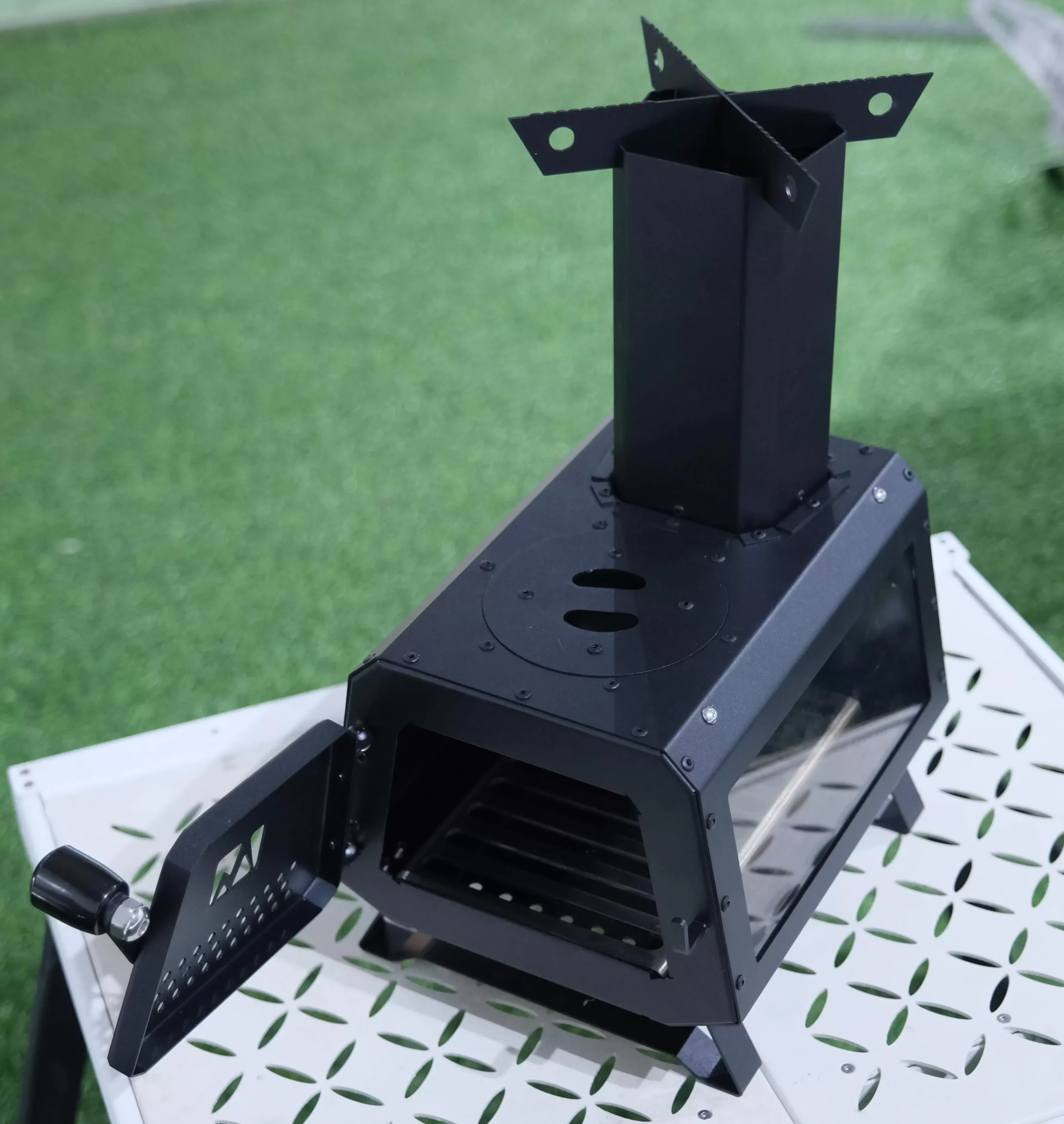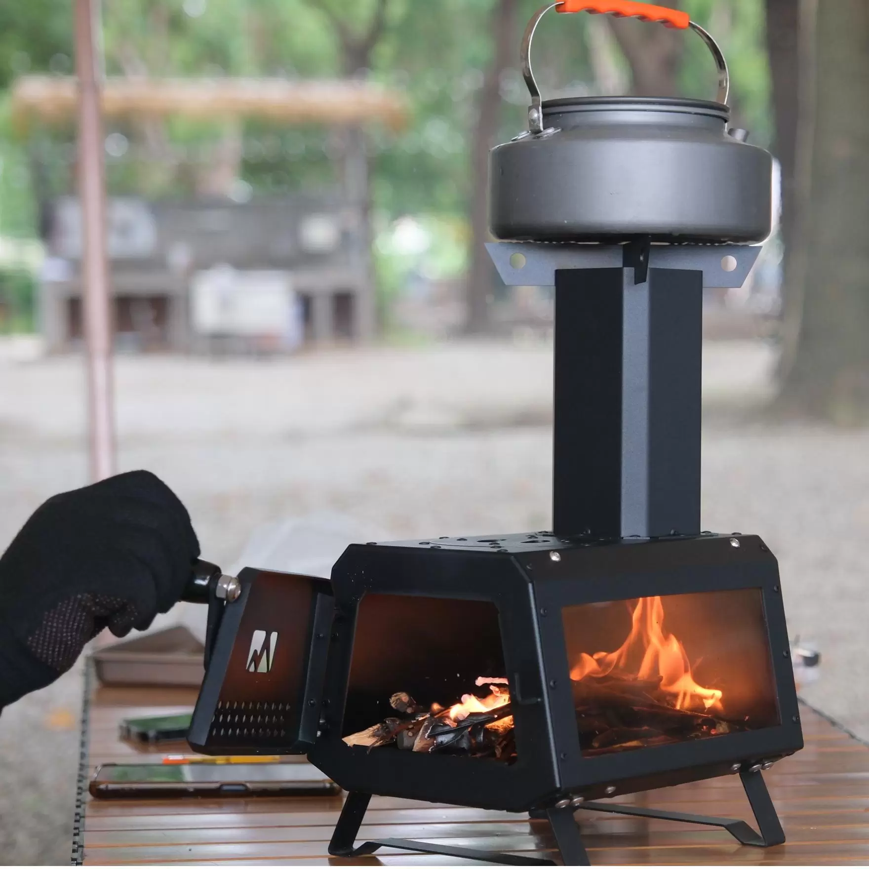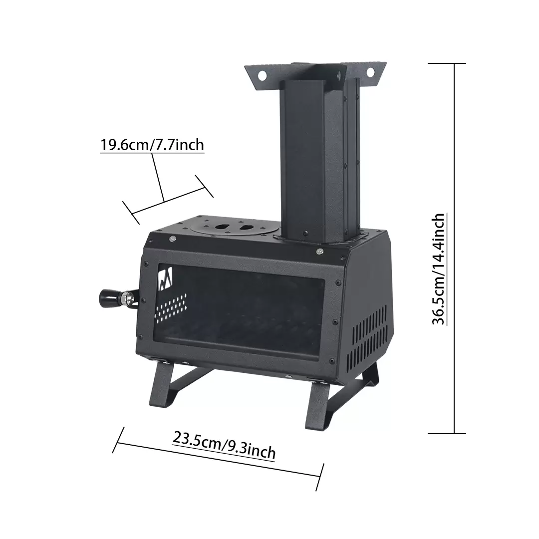 This multifunctional rocket stove is made of sturdy and durable stainless steel material, ensuring long-term corrosion resistance; The outer iron plate is treated with high-quality spray coating, which not only provides additional protection, but also supports personalized color customization, making your stove perfectly match your style. Its exquisite integrated structure makes it easy to store all accessories inside the furnace body, bidding farewell to scattered items and making travel portable and worry free. The front door is equipped with an efficient air intake, combined with carefully arranged secondary air intake channels at the bottom and rear, which work together to strongly guide flames to efficiently converge towards the chimney core; The secondary oxygen replenishment design specially added at the chimney further enhances combustion and efficiency, not only upgrading the firepower but also achieving clean and thorough smokeless combustion. Foldable and stable legs make storage extremely easy, and when unfolded, they become stable. The large area of heat-resistant glass windows on the side allow you to clearly and safely enjoy the stunning scene of flames leaping in the furnace even when sitting at a table. The multifunctional fire cover at the top, which can be flexibly removed, provides you with a variety of cooking possibilities – whether it is leisurely brewing tea, quickly boiling water, or directly cooking delicious food, all with ease. Combining efficient combustion, convenient storage, personalized appearance, and multi scenario applications, it is undoubtedly an indispensable desktop portable fire center for your exquisite camping, courtyard gathering, or outdoor leisure.